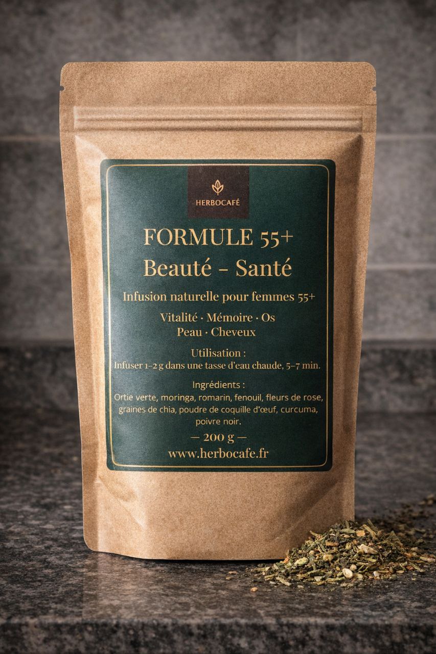 Formule 55+™ associe une sélection de plantes naturelles choisies pour accompagner la vitalité, la mémoire et le bien-être global au quotidien.